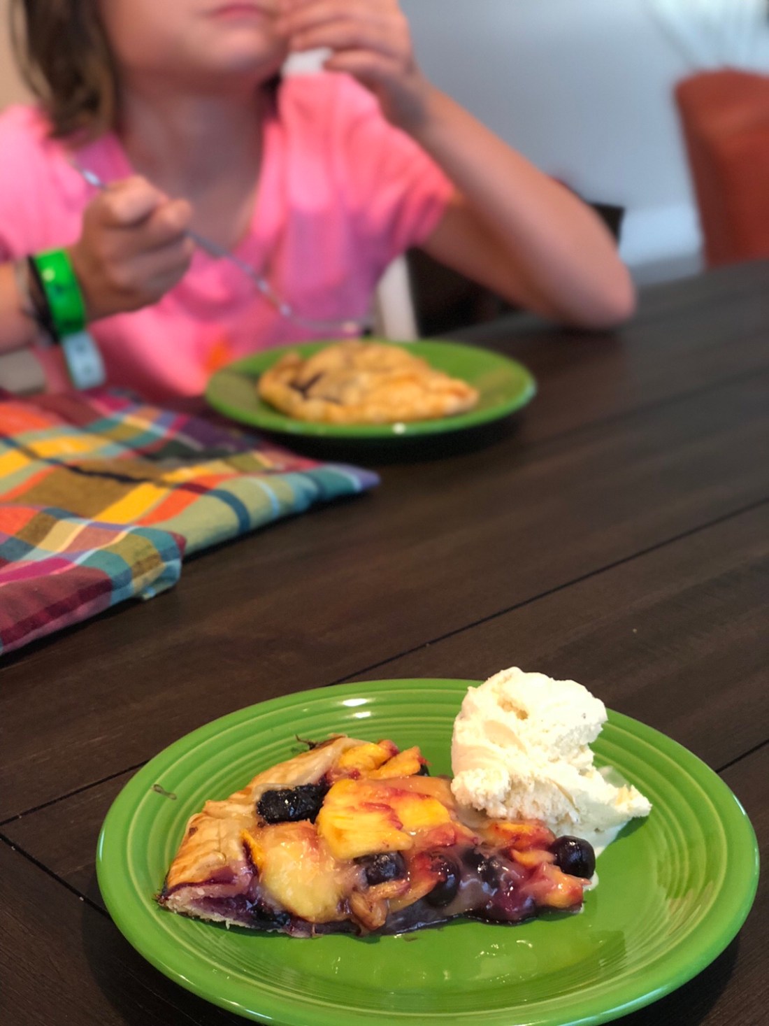 When it’s done, slice it up and serve it warm with vanilla ice cream. The cool, smooth ice cream cuts the tart, richness of the peach-za and you end up with a dessert almost as beautiful as the word-play that inspired it.