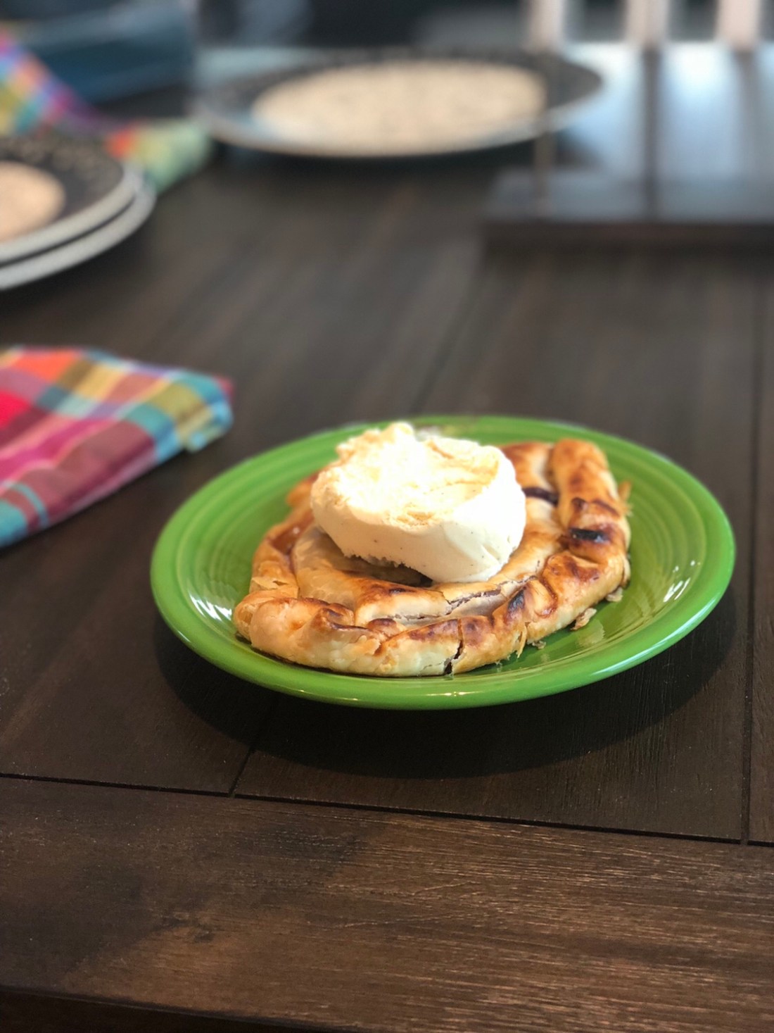 - Bake 40 minutes. Keep an eye on the crust and if it starts browning, cover with foil. Remove from oven and let cool for a bit. Serve warm with cold vanilla ice cream.